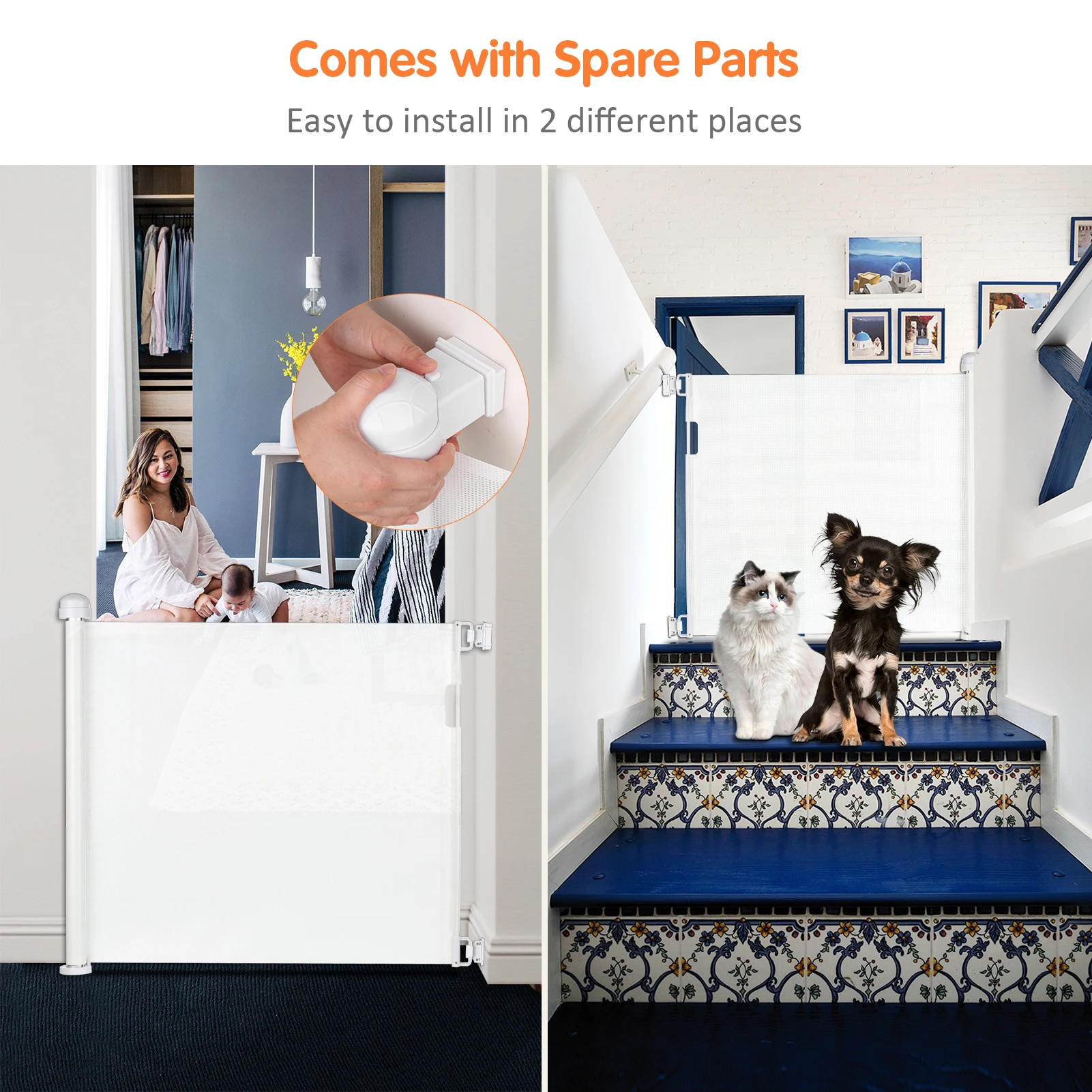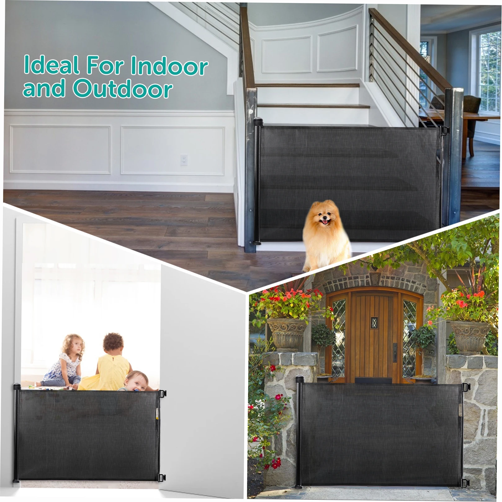 【Easily Move to 2 Different Place】 Package include 2 sets of installation hardware. This retractable dog gate extra wide can be easily moved and de-attached from the gate mount hardware, to stow away or move to another location where another set of hardware installed. It can be used indoor and outdoor.